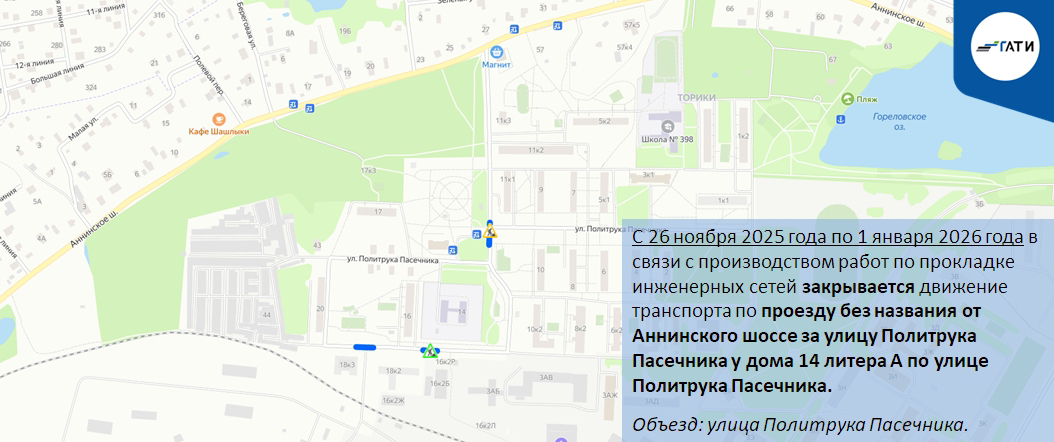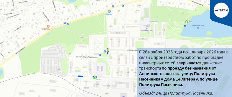 С 26 ноября 2025 года по 1 января 2026 года закроют проезд без названия от Аннинского шоссе за улицу Политрука Пасечника у дома 14 лит. А.