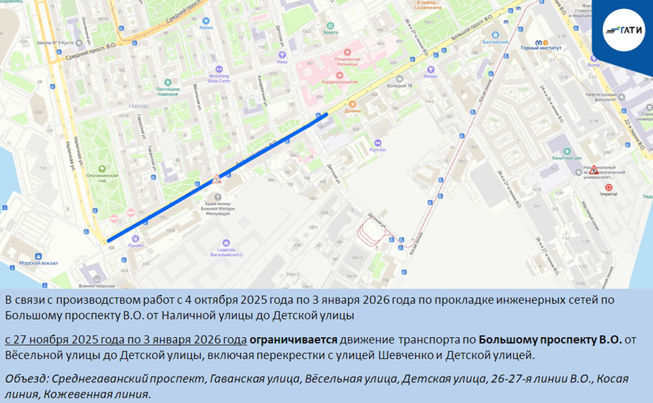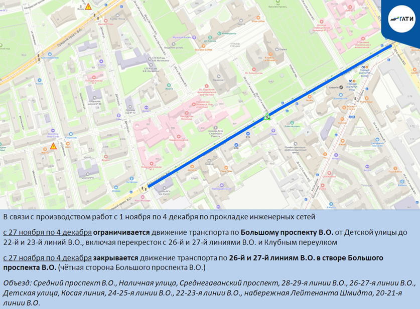 Первый ограничат с 27 ноября по 4 декабря. На этот же период здесь закроют проезд по 26-й и 27-й линиям В.О. в створе Большого проспекта В.О.