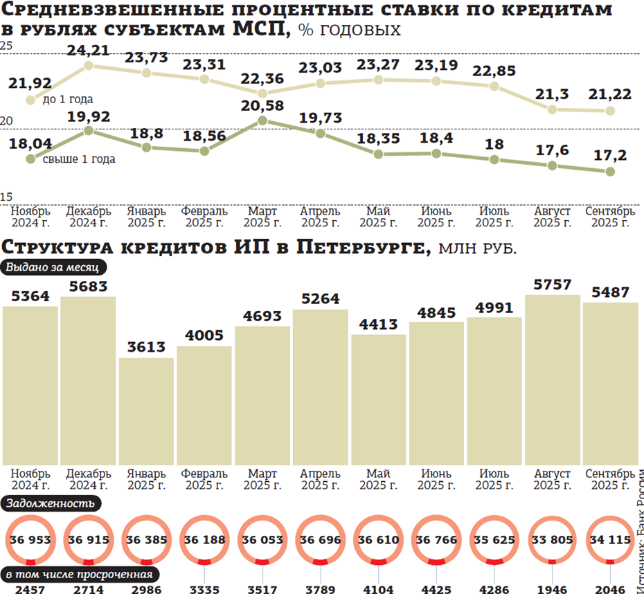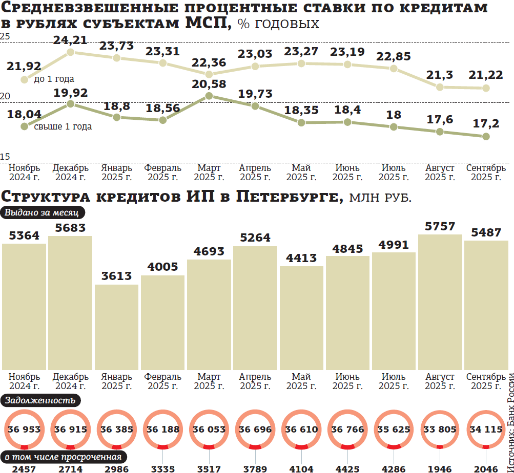 Банки заявляют о своей готовности продолжать кредитование ИП: выдачи в январе–сентябре 2025–го оказались на 2,2% больше, чем за тот же период 2024–го (в текущем периоде выдано 43,1 млрд рублей против 42,1 млрд годом ранее). При этом минувший год был достаточно успешным для рынка: по оценке агентства "Эксперт РА", кредитный портфель МСБ по стране прибавил 17%. Но восстановление спроса тормозят высокие ставки и жёсткие условия со стороны кредиторов как к залоговому обеспечению, так и к видам деятельности ИП.