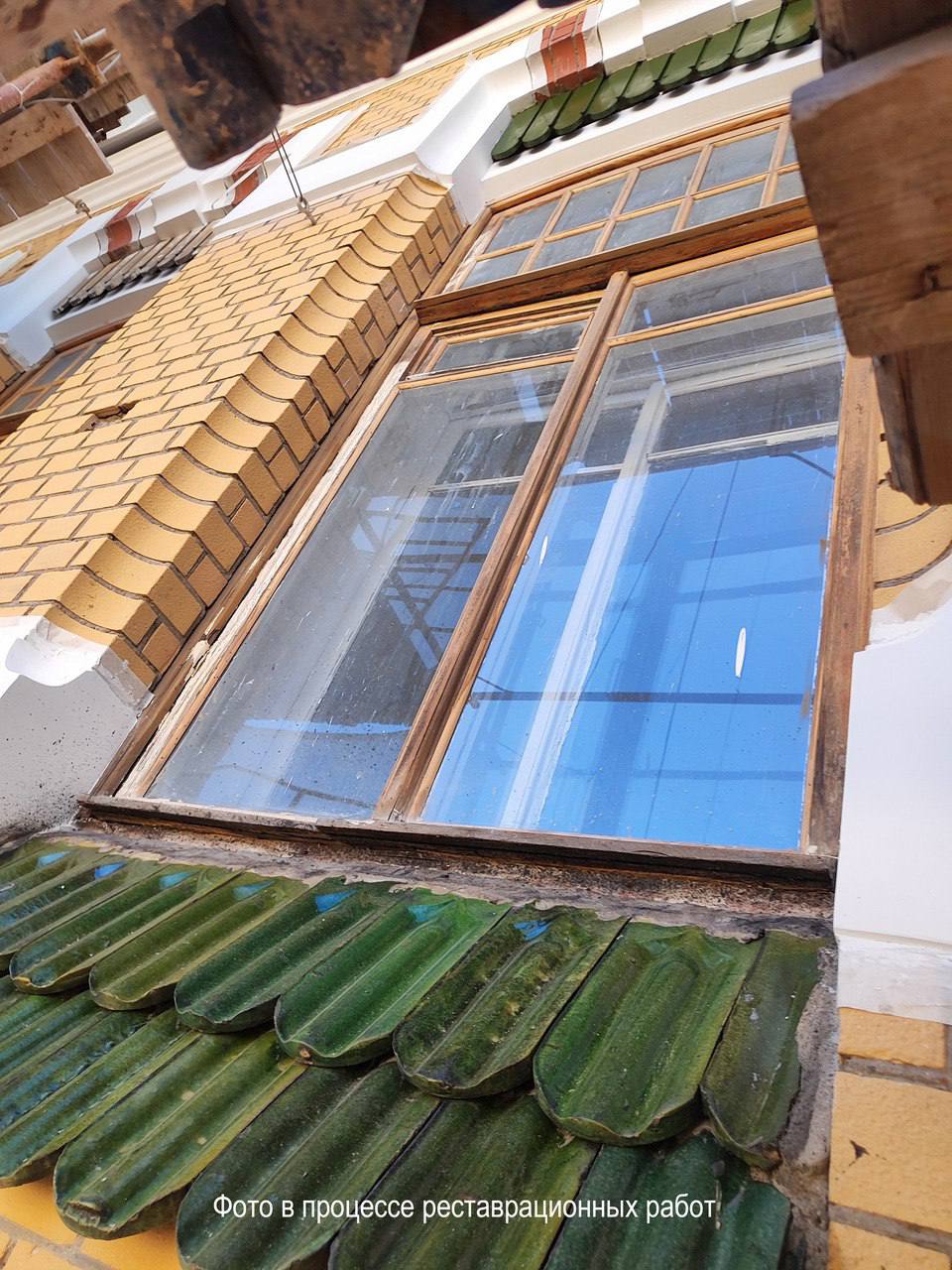 В рамках реставрации фасаду вернули исторический цвет, обновили уникальную отделку из плитки "кабанчик", отремонтировали несущие конструкции балконов. Также восстановлен лепной декор с листьями чертополоха под балконами, кованые ограждения и чешуйчатые покрытия эркеров. Отреставрированы окна и балконные двери, восстановлен рисунок расстекловки, восстановлены керамические глазурованные отливы окон. Кованое парапетное ограждение кровли восстановили по архивным чертежам и найденному на чердаке историческому фрагменту.