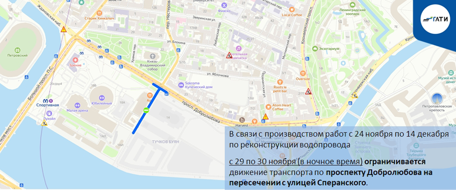 Проспект Добролюбова в районе улицы Сперанского будут сужать в ночное время, сообщили в ГАТИ.