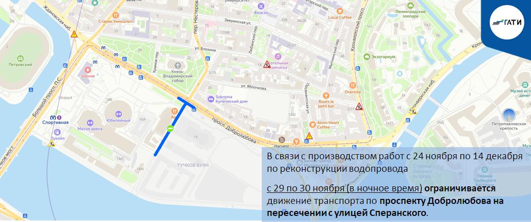 Вступают в силу ограничения на проспекте Добролюбова недалеко от станции метро "Спортивная". ГУП "Водоканал Санкт-Петербурга" продолжает реконструировать в этом районе водопровод.