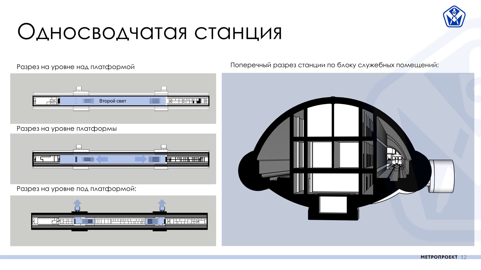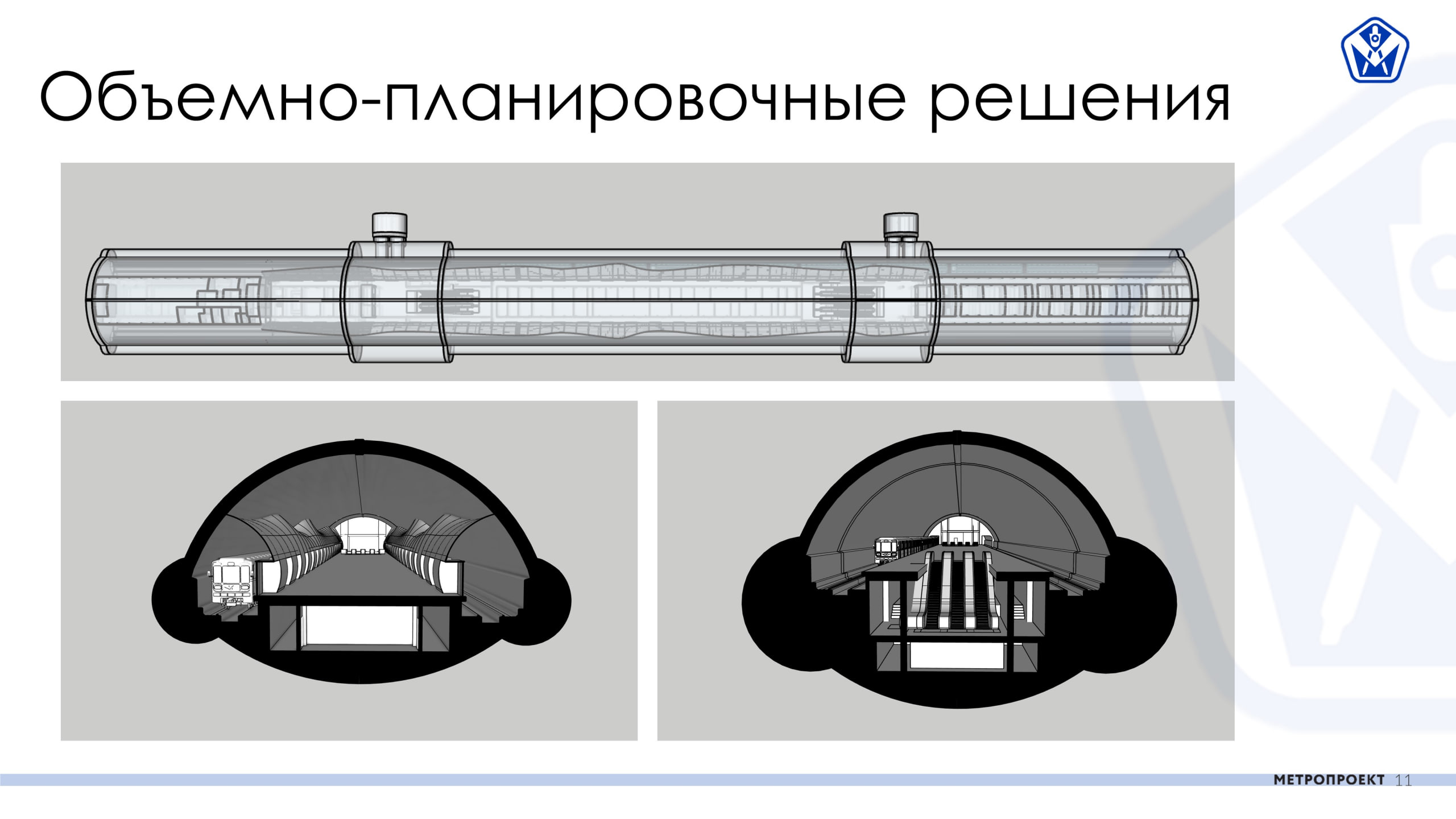 "Обратный же свод стал более выпуклым — вместо 22,75 м его радиус уменьшился до 15 м, что дало заметную прибавку к высоте служебных помещений под платформой. Блоки сводов потолстели на 100 мм — до 800 для верхнего и 500 мм для нижнего. Положение распорных блоков с домкратами для расжатия сводов осталось аналогичным предыдущей версии односвода, применённой на станциях участков МП-5, П-2 и П-3: один по центру верхнего свода и два в обратном своде, установленные симметрично относительно оси станции, ближе к опорным тоннелям", — комментируют проект в "Ленметрокавестранс".