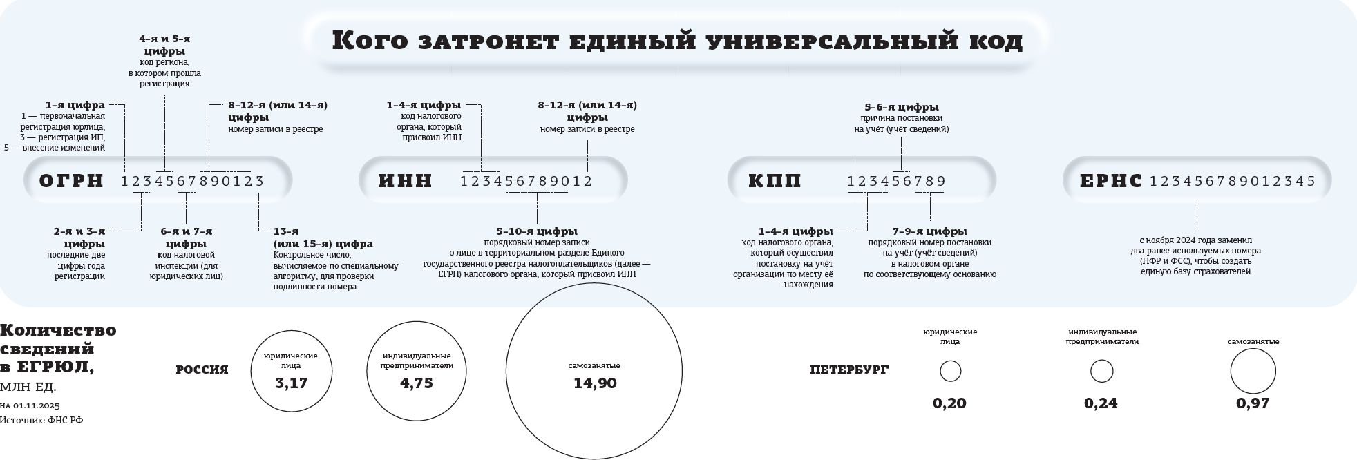 Предполагается внедрение нового единого идентификатора для юридических лиц, который сможет заменить существующие: идентификационный номер налогоплательщика (ИНН), основной государственный регистрационный номер (ОГРН) и единый регистрационный номер страхователя (ЕРНС).