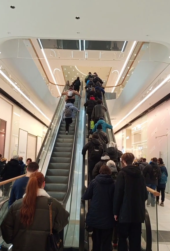 В обеденное время один из эскалаторов, ведущий наверх, внезапно остановился. Некоторые посетители стали даже подниматься против движения по второму эскалатору, который ведёт вниз.