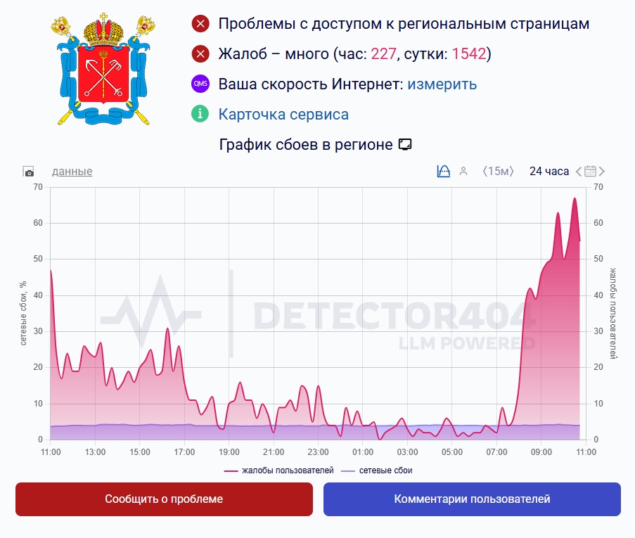 За сутки в регионе уже зафиксировано 1522 жалоб. Сбои могут быть связаны из-за объявленной утром 2 декабря в Ленинградской области опасности БПЛА. Воздушную тревогу в регионе объявляют второй день подряд.