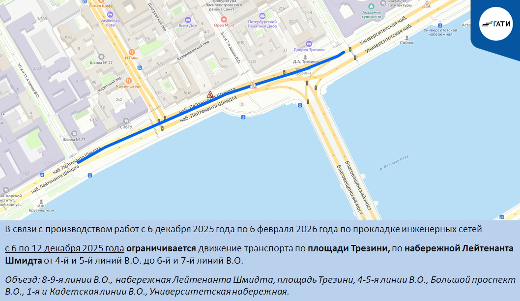На набережной Лейтенанта Шмидта ГУП "Водоканал Санкт-Петербурга" начинает прокладывать инженерные сети. Из-за этого с 6 по 12 декабря ограничат участок от 4-й и 5-й линий В.О. до 6-й и 7-й линий В.О., а также площадь Трезини.