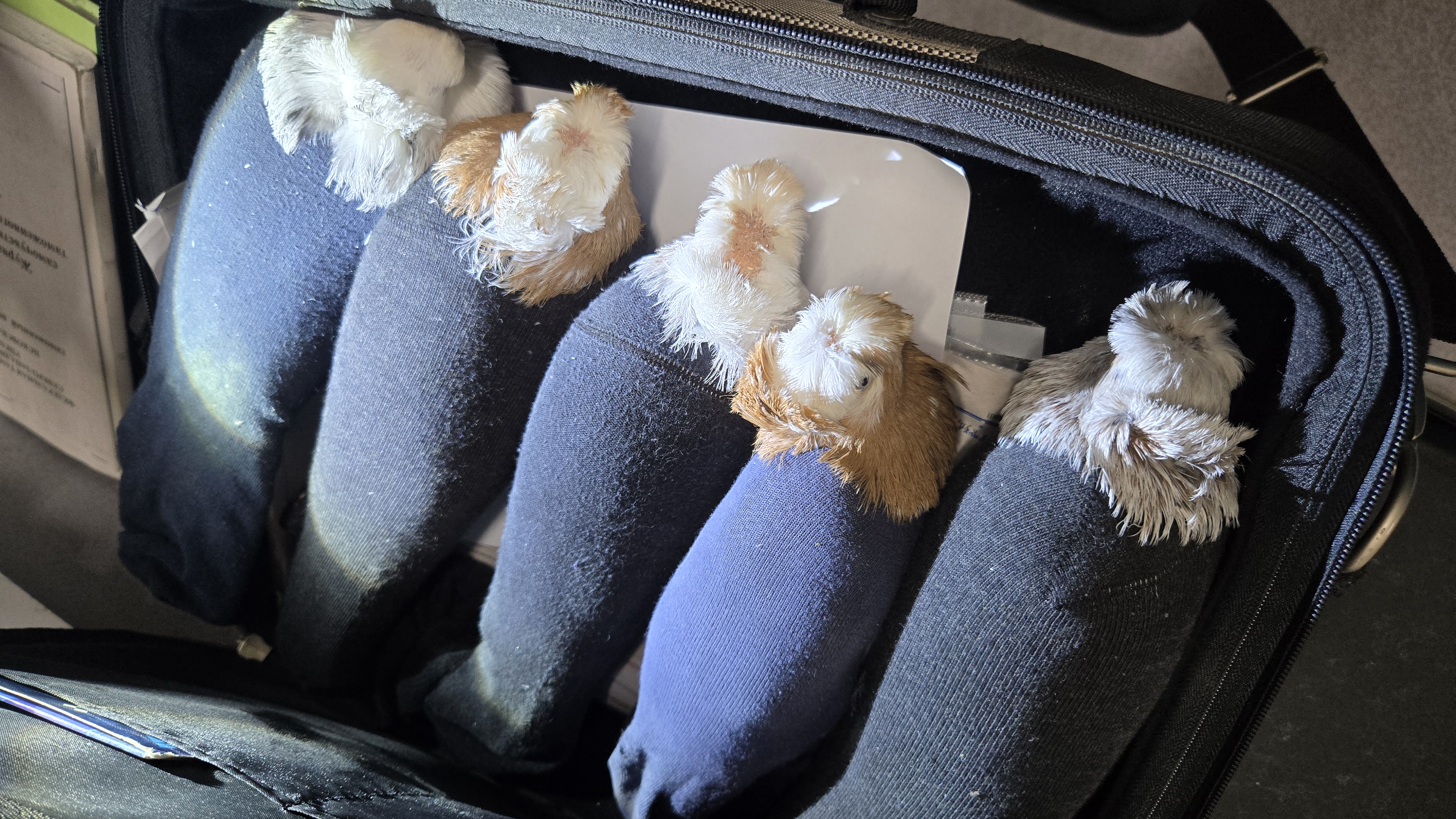 Мужчина поместил каждую птицу в носок, вероятно, чтобы обездвижить их, и закрыл в чемодане.