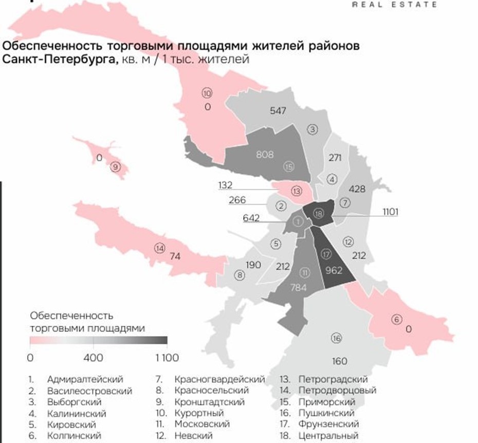 Согласно данным IBC Real Estate, в 12 из 18 районов обеспеченность качественными торговыми площадями ниже среднего городского уровня, а в Колпинском, Кронштадтском и Курортном районах показатель фактически равен нулю.