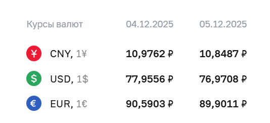 Официальный курс доллара на 5 декабря, установленный Центробанком, составил 76,97 со снижением на 0,98 от последнего курса, курс евро составил 89,90 (-0,69), юаня — 10,85 (-0,13).