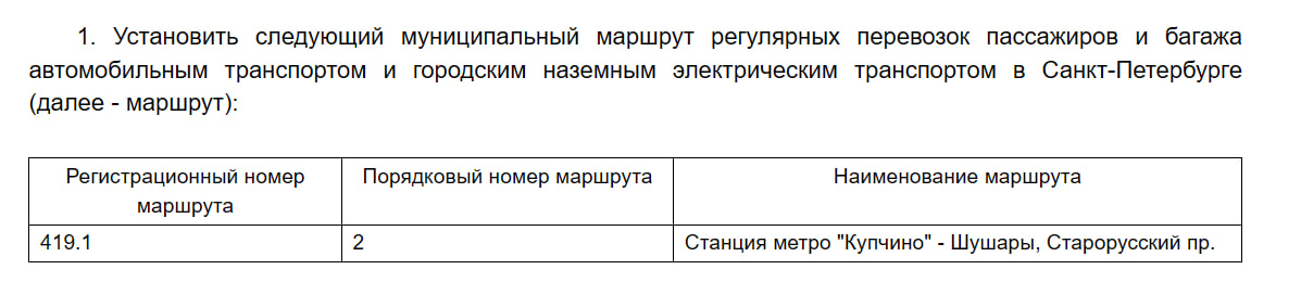 Согласно документу, в реестр маршрутов регулярных перевозок внесён новый пункт №2. Маршрут свяжет станцию метро "Купчино" и Старорусский проспект в посёлке Шушары (Пушкинский район).
