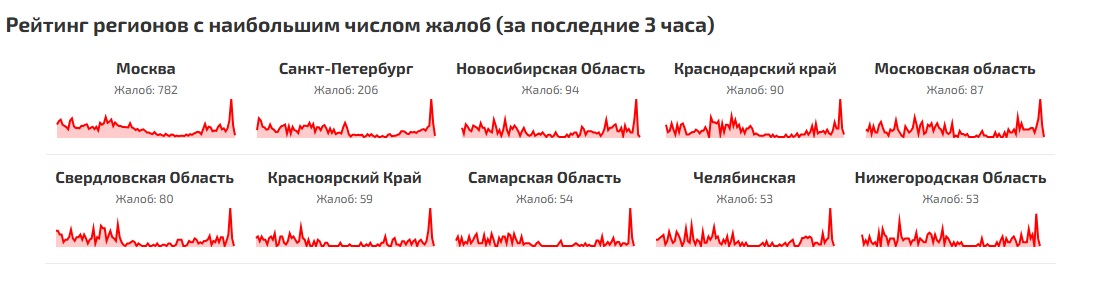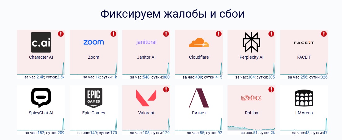 Российские пользователи жалуются на сайтах сбой.рф. и detector404.ru на проблемы с подключением к разным интернет-порталам, игровым платформам и ИИ-приложениям. За последние 3 часа больше всего жалоб поступило от жителей Москвы, петербуржцы сообщили о проблемах со связью 212 раз.