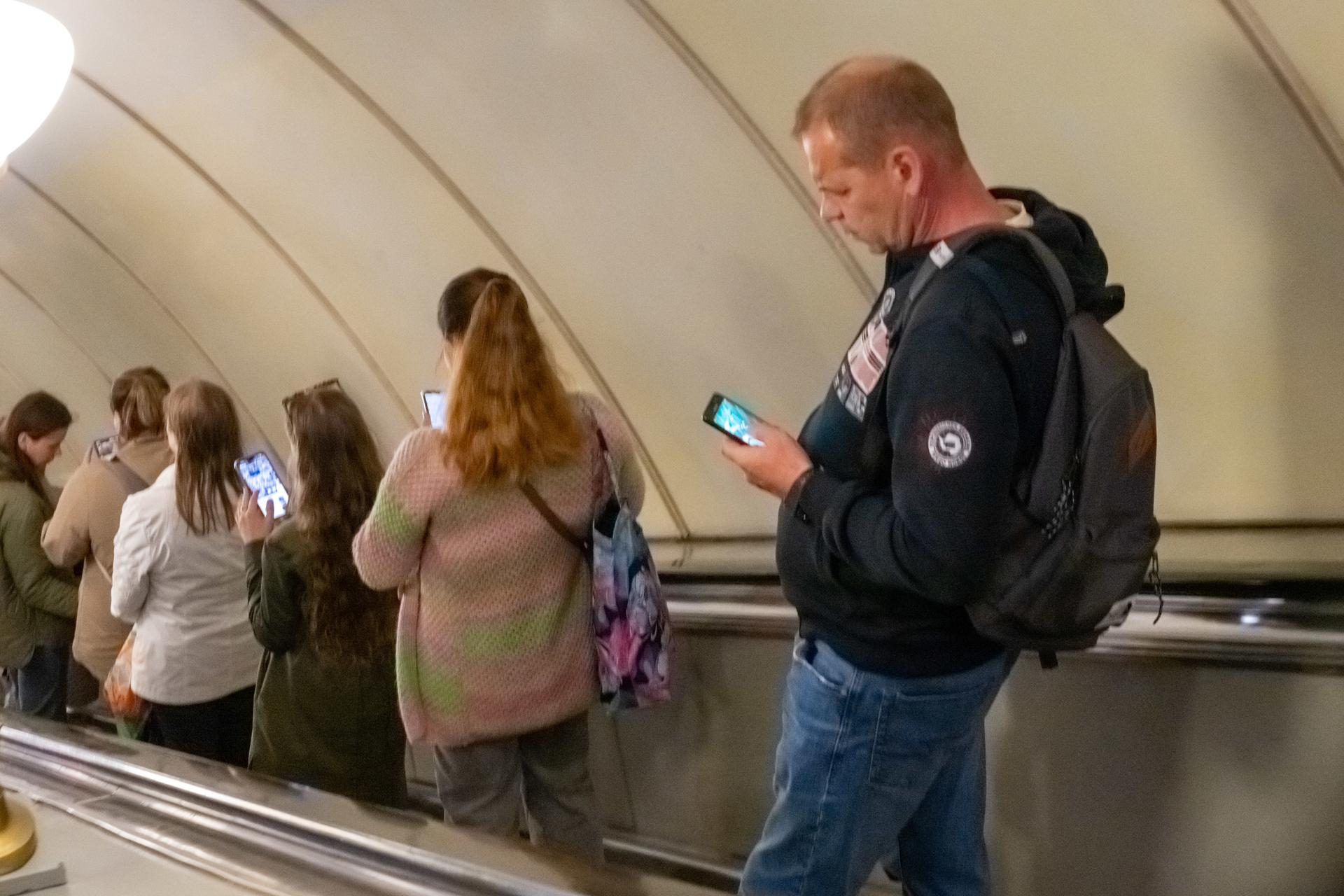 Подземный интернет. Группа пассажиров метро спускается на эскалаторе и просматривает сообщения на экране смартфона.