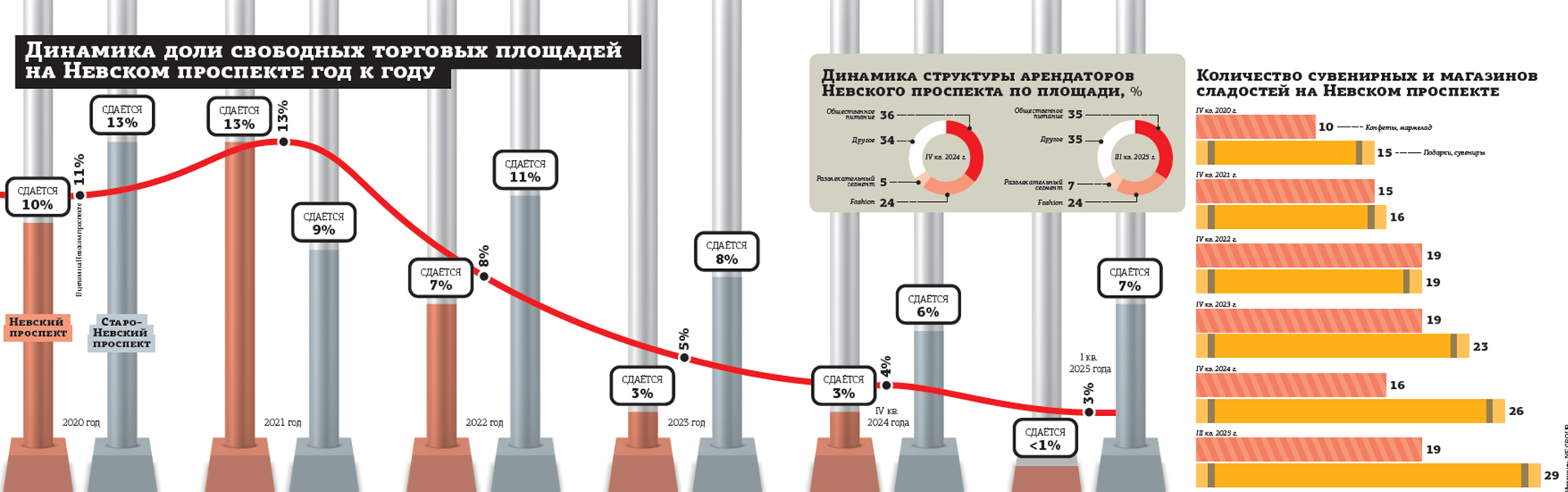 Прогуливаясь по Невскому проспекту, невозможно не заметить, как он изменился за последние годы. Уход международных брендов, снижение туристского потока, изменение потребительских привычек — всё это серьёзно повлияло на портрет арендаторов и внешний облик самого проспекта.