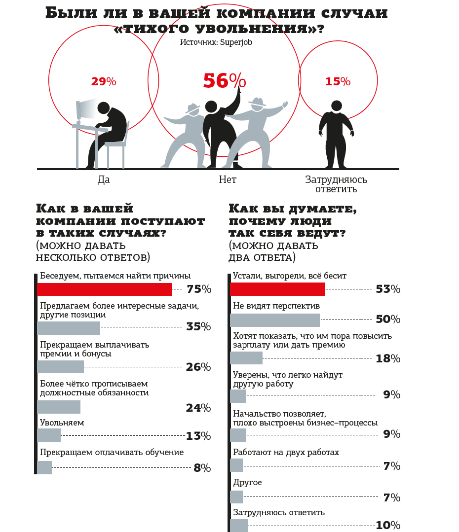 В прежние времена в ходу был другой термин — "итальянская забастовка". Но его обычно применяли, когда рассказывали о борьбе рабочего класса за свои права в конце XIX — начале XX века. Нынешнее же "тихое увольнение" — актуальная проблема почти для трети российских компаний. Как следует из данных опроса, проведённого порталом Superjob, в 2024 году о наличии таких работников сообщал 31% представителей бизнеса, в 2025–м — 29%. То есть тренд можно считать довольно устойчивым.