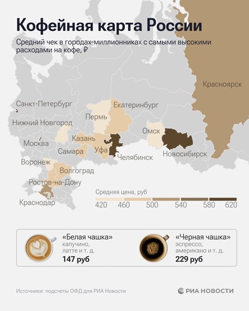 Что касается других регионов России, много денег в кофейнях оставляют жители Москвы — в среднем 564 рубля, Красноярска — 506 рублей и Краснодара — 501 рубль.