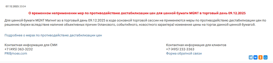 Возможной причиной повышения могло стать сообщение от Мосбиржи о временном прекращении мер по противодействию дестабилизации цен на акции MGNT, которое впоследствии было удалено.