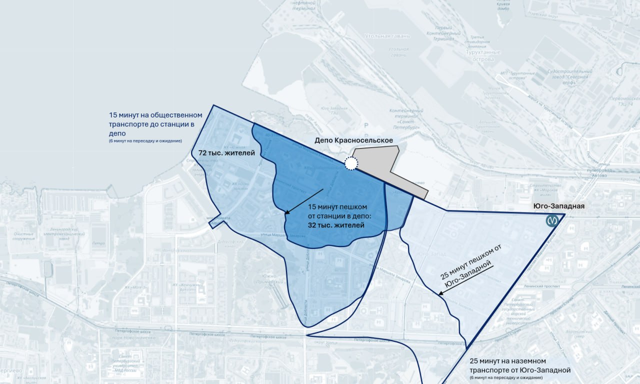 По оценкам руководителя проектов компании STEP City Георгия Фролова, рассчитанным на основе открытых данных, станция при депо обеспечит 15–минутную пешую доступность к метро для 32 тыс. петербуржцев. А в пределах 15–минутной поездки на наземном транспорте проживают 72 тыс. горожан.