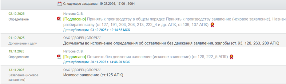 2 декабря суд опубликовал определение о принятии искового заявления, так как на этот раз оно было подано уже по всем правилам. Судебное заседание по делу назначено на 19 февраля.