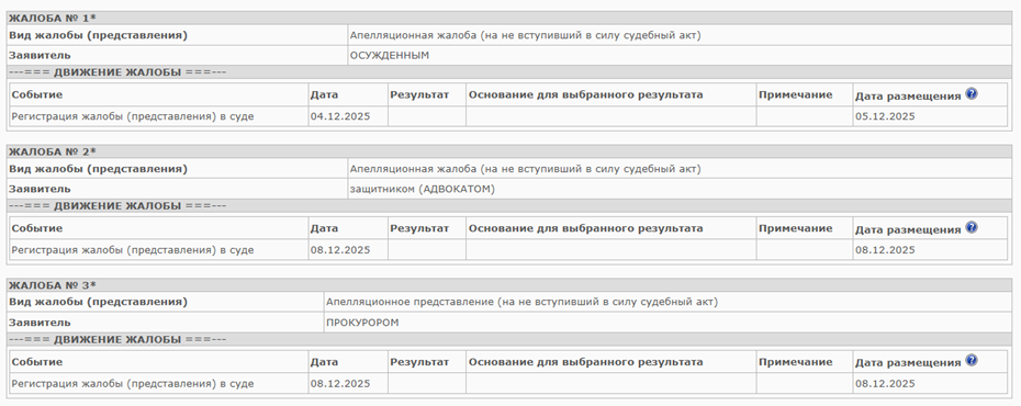 4 декабря в суд поступила апелляционная жалоба от одного осуждённого, 8 декабря зарегистрированы две жалобы — от адвоката и от прокуратуры.