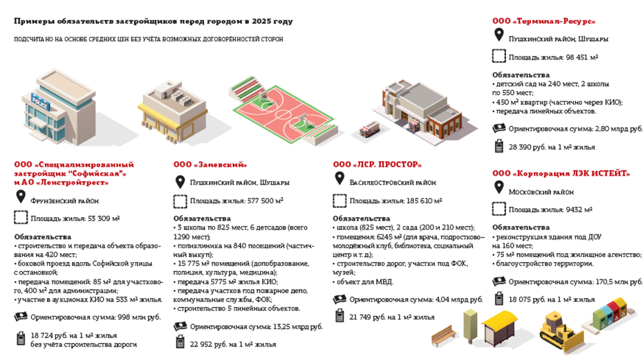 По оценкам экспертов, совокупный объём обязательств по социальным объектам при этом превысил 240 млрд рублей, что составляет примерно 21,7 тыс. рублей на квадратный метр жилья. Всего в структуру обязательств за этот период входят 127 детских садов, 71 школа, 15 поликлиник и десятки объектов транспортного назначения.
