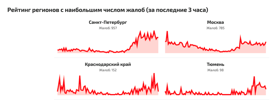 На сайте Сбой.рф Петербург теперь занимает первое место среди регионов с наибольшим числом жалоб за последние 3 часа, там зафиксирована почти 1 тыс. обращений.