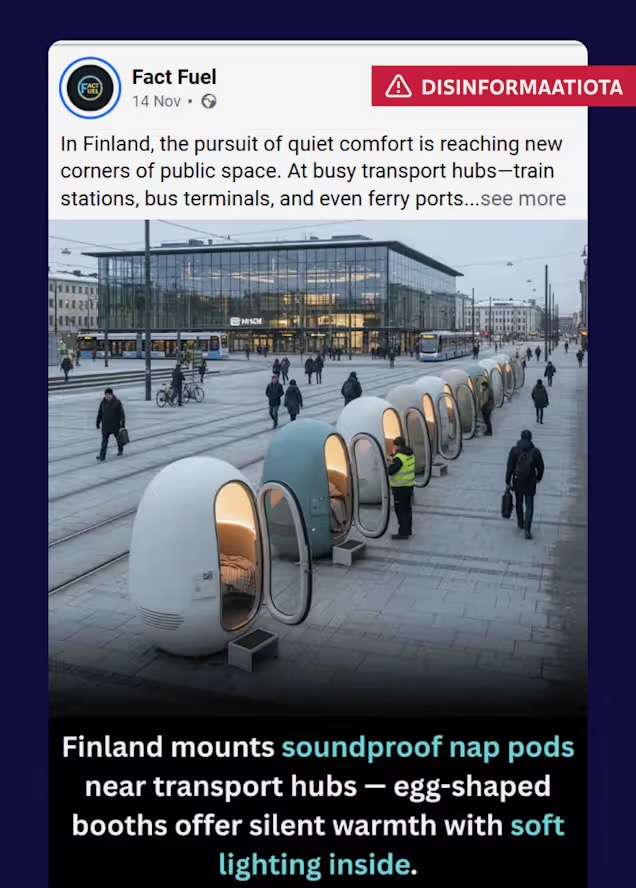 "Любому человеку, живущему в Финляндии или хотя бы посещавшему её, понятно, что это фейк. Единственные "спальные капсулы", которые можно найти в Финляндии, находятся в столичном аэропорту, однако их можно использовать лишь после брони", — говорится в публикации.