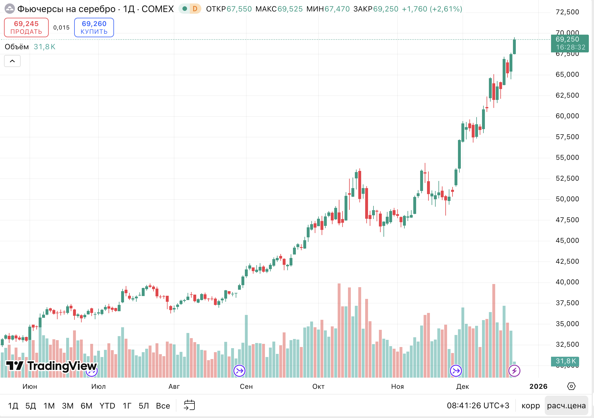 Фьючерсы на серебро с поставкой в марте на бирже Comex в понедельник, 22 декабря, подорожали на 3,02%, их цена на пике поднялась до $69,525 за унцию.