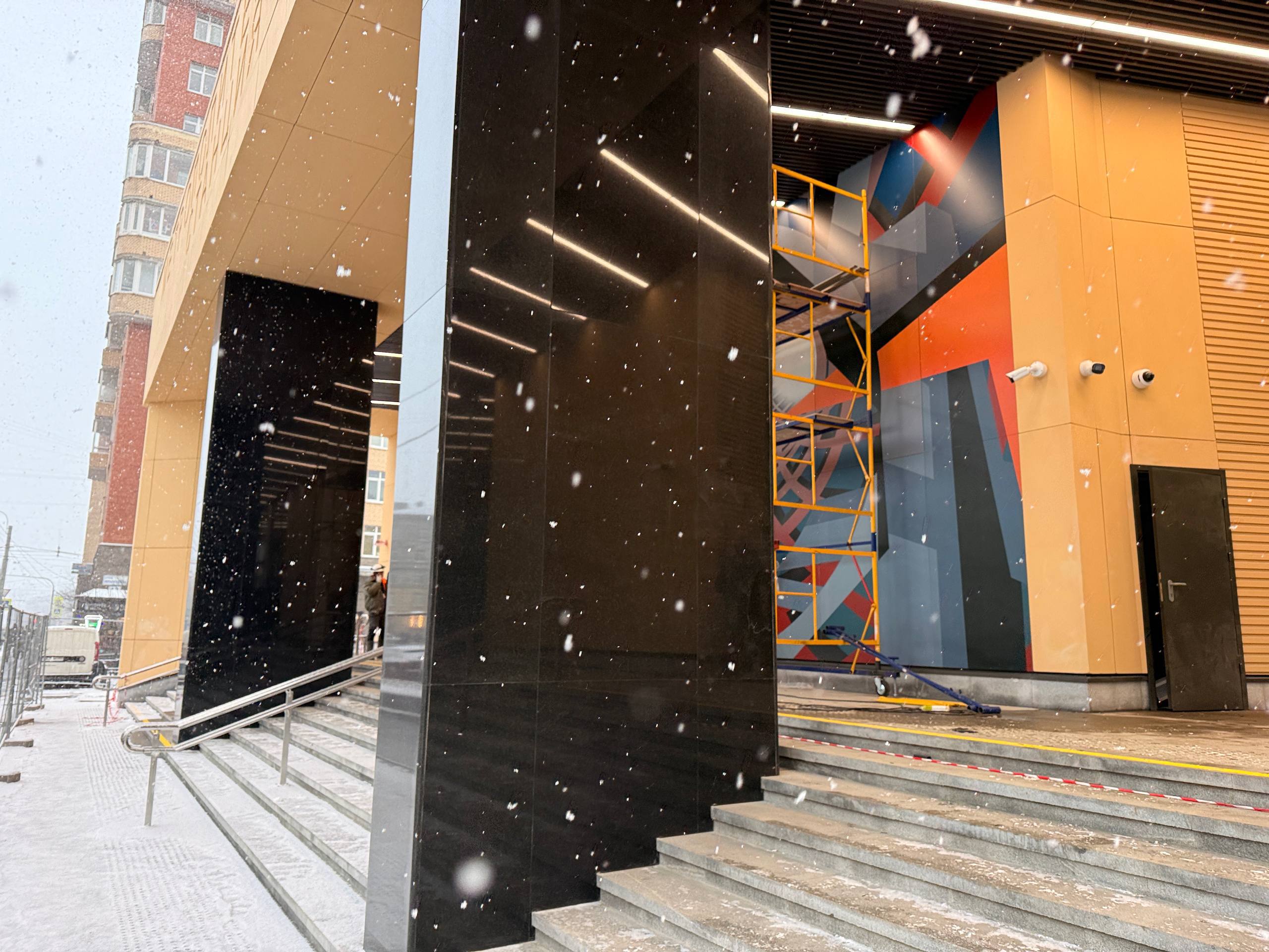Речь о выходящей на улицу Васи Алексеева стороне. Также специалисты закончили облицовку вестибюля, в работе использовались панели из фибробетона. Помимо этого, здесь смонтировано декоративное панно. Облицовка ступеней также полностью завершена, это же касается пола и пандуса для маломобильных пассажиров, в работе использованы гранитные плиты. Здесь же установлены поручни на лестнице перед входом и выходом и обустроены перила ограждения пандуса.