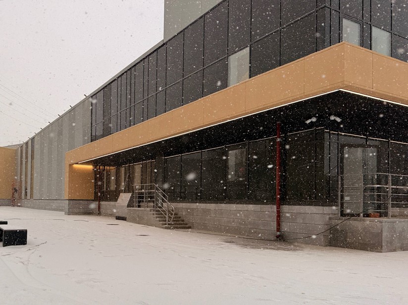 Со стороны внутреннего двора подрядчик завершил установку фасадных плит на козырьке служебной части вестибюля, реечного потолка (куботы) и светильников.