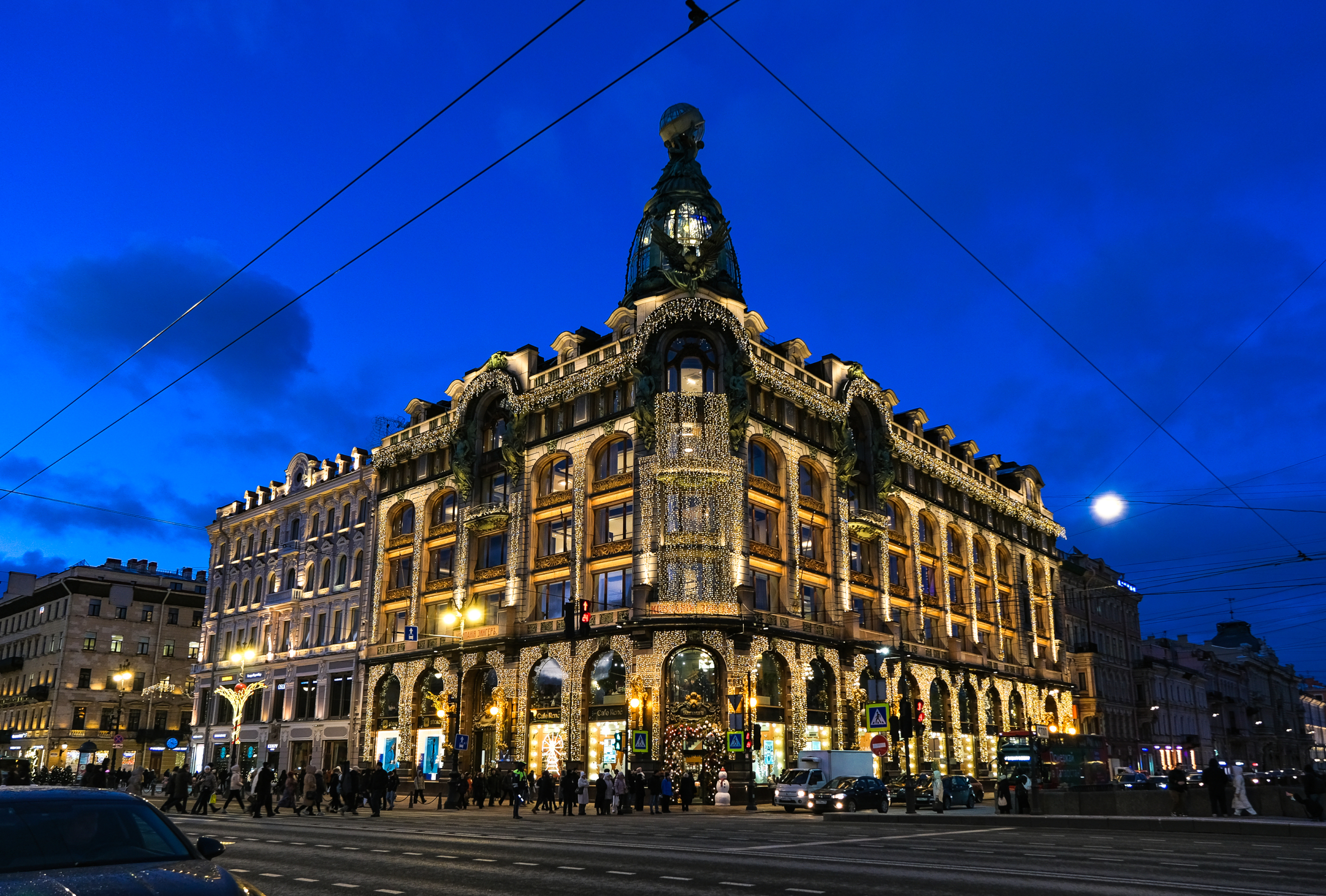 Дом Зингера в канун Нового года украсила новая художественная подсветка из 539 светильников, сообщили в Смольном.
