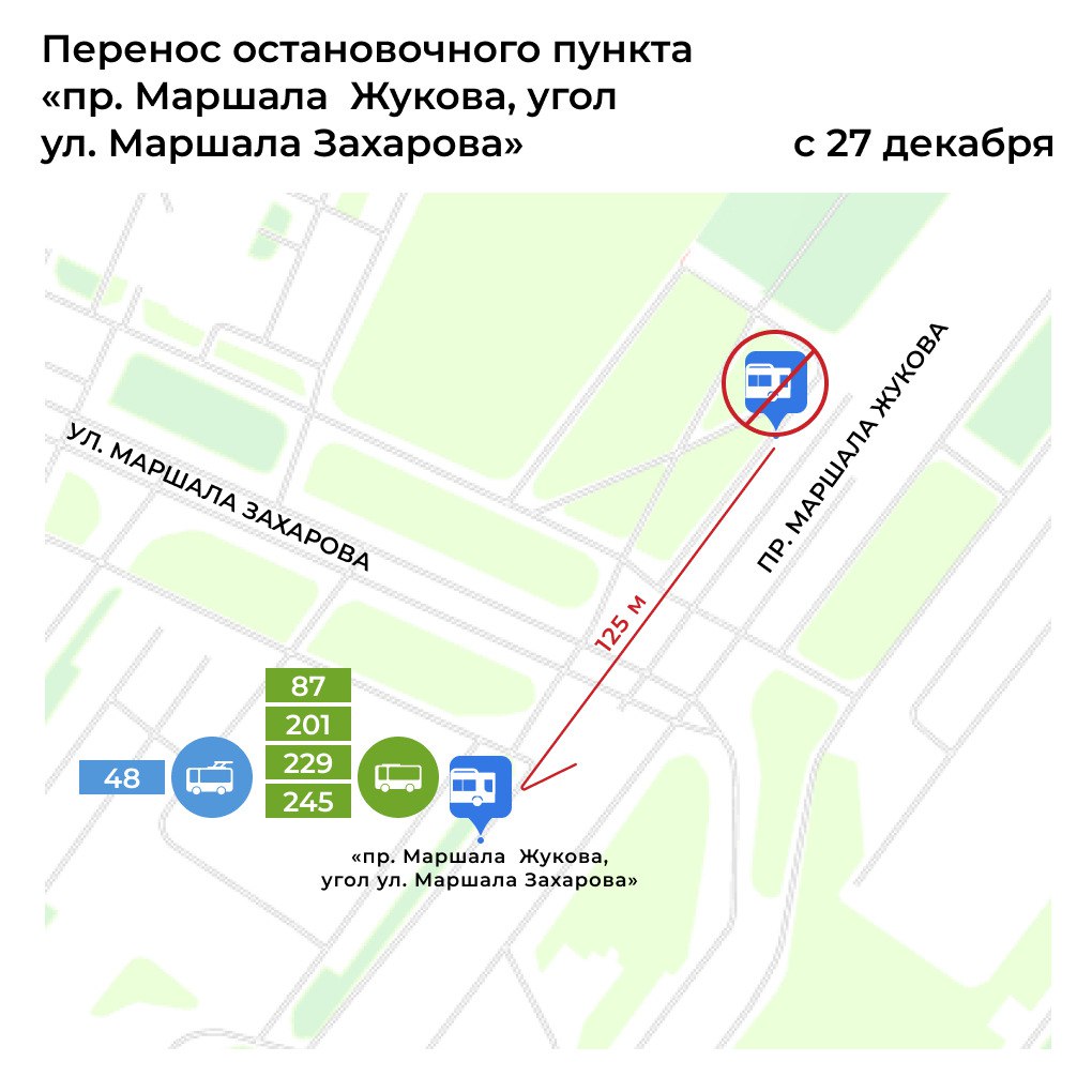С 27 декабря переносится остановка "проспект Маршала Жукова, угол улицы Маршала Захарова" на автобусных маршрутах № 87, 201, 229, 245 и троллейбусном маршруте №48. Также изменят название остановки "проспект Маршала Жукова", "улица Маршала Казакова" и "улица Маршала Говорова" на маршрутах № 2, 26, 111, 203, 229, 245, 300, 333. Для автобусов № 72, 73, 244 переименуют остановку "улица Маршала Говорова".