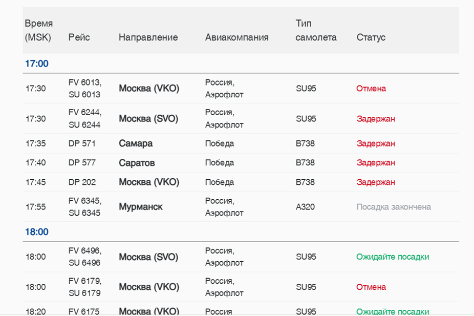 Согласно данным онлайн-табло Пулково, на 17:39 было отменено два рейса во Внуково, один рейс во Внуково задержан. Также задержан один борт в Шереметьево. Помимо этого, задерживается вылет самолётов в Самару и Саратов.