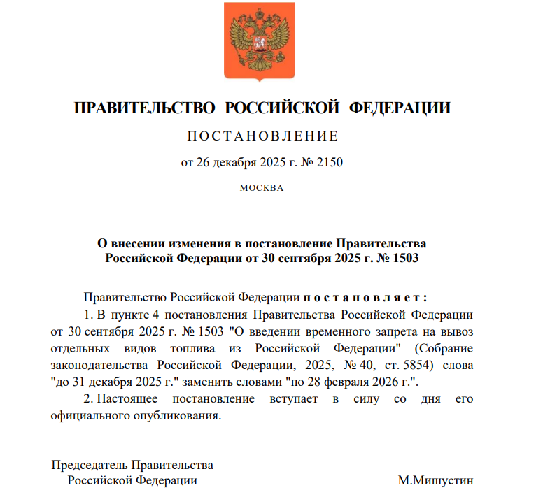Оба эмбарго продлены до 28 февраля 2026 года. Меры введены для поддержания стабильности на топливном рынке. Ограничения вступят в силу 28 декабря.