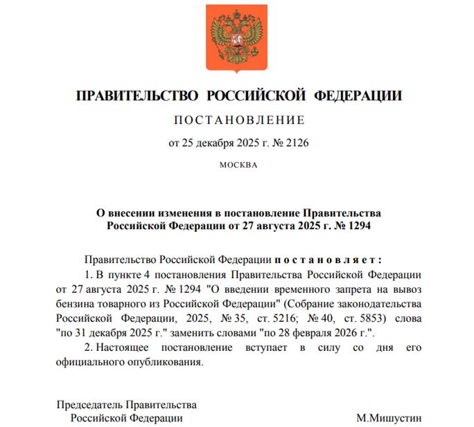 В середине декабря сообщалось, что запрет на вывоз бензина из РФ может быть продлён до конца февраля 2026 года, информация была обнародована после заседания штаба по ситуации на рынке нефтепродуктов под руководством вице-премьера Александра Новака.