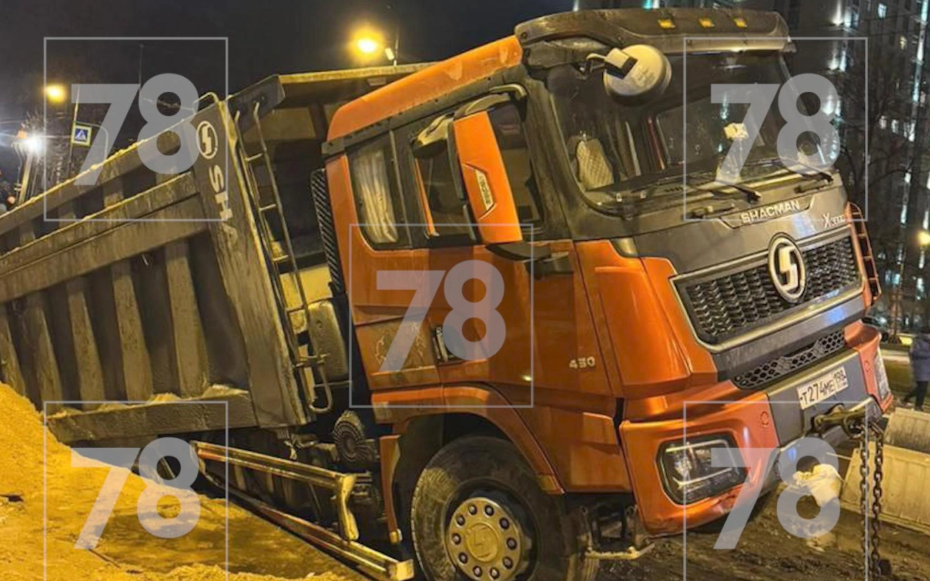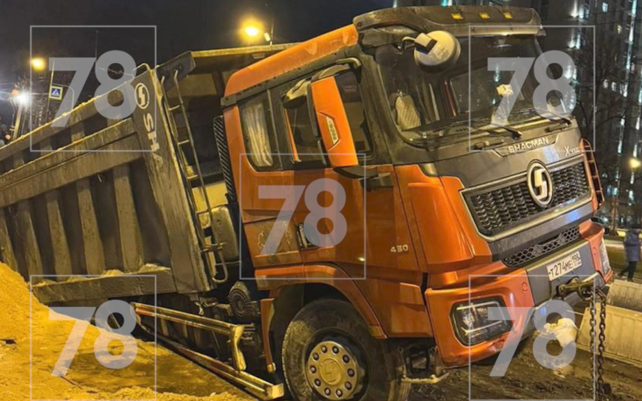 Самосвал провалился в дыру в асфальте в Петербурге, сообщают очевидцы.