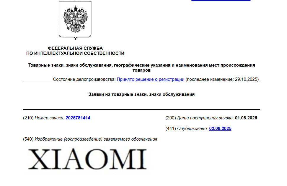 Два товарных знака для компании Xiaomi из КНР зарегистрированы в Роспатенте, согласно данным электронной системы ведомства.