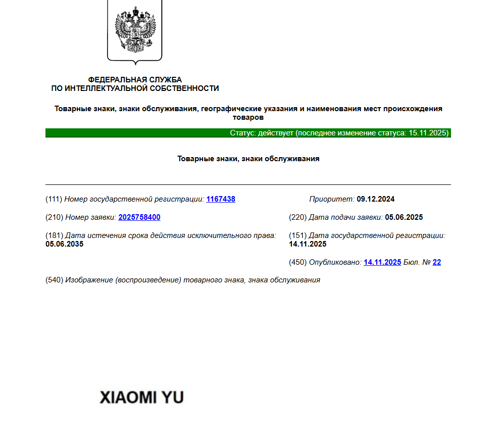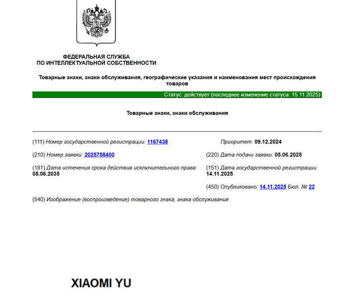 Товарные знаки китайской корпорации носят названия Xiaomi YU и Xiaomi. Федеральная служба по интеллектуальной собственности (Роспатент) приняла решение зарегистрировать товарные знаки компании.