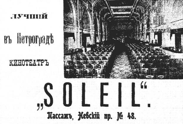 Один из самых роскошных кинотеатров появился в "Пассаже". Он занимал два этажа, в его распоряжении был целый струнный оркестр, в качестве музыкального сопровождения использовали живое пение. Кинопрограммы длились по три часа, а зал вмещал почти четыре сотни человек. Просуществовал он два года, затем его сменил следующий под названием "Солейль".
