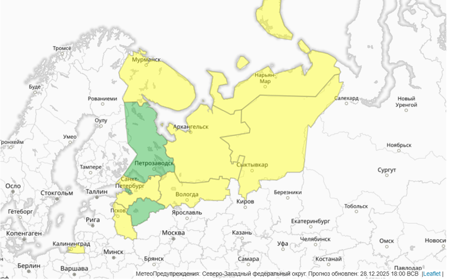 Петербургский Гидрометцентр также прогнозировал на 29 декабря понижение температуры до –1... –5 градусов. В Северной столице будет облачно, с небольшими осадками. Ветер ожидается западный, 4 м/с. Атмосферное давление второй день подряд будет ниже нормы.