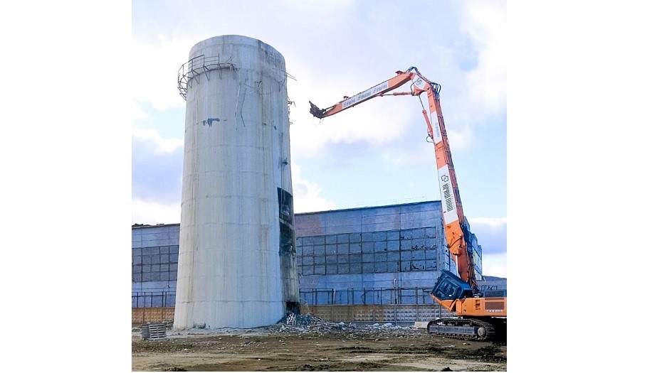 Дымовая труба из монолитного железобетона объёмом более 8000 м³ высотой 110 метров была демонтирована комбинированным методом, сочетающим ручной демонтаж и механизированный способ с применением высотного экскаватора.
