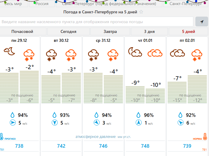 "Вечером — небольшой снег. Ближайшей ночью переменная облачность, небольшой снег, местами дымка, температура –3...–5°. Давление очень низкое", — говорится в сводке.