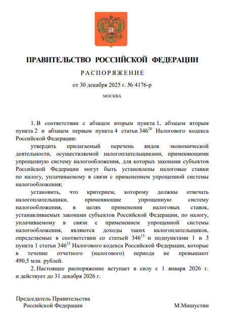 Критерием, которому должны отвечать налогоплательщики, являются доходы, которые в течение отчетного (налогового) периода не превышают 490,5 млн. рублей. Распоряжение вступило в силу с 1 января и действует до 31 декабря 2026 года.
