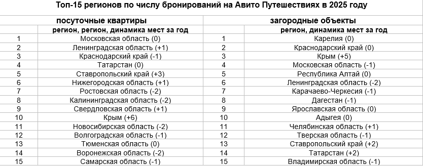 Топ-15 регионов по числу бронирований на Авито Путешествиях в 2025 году