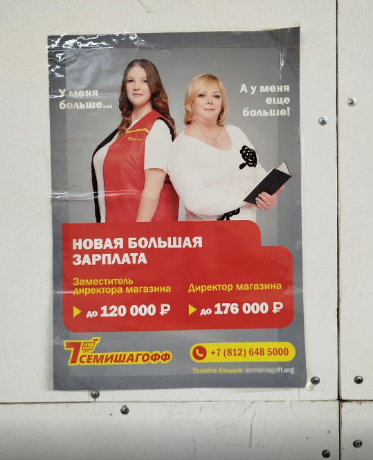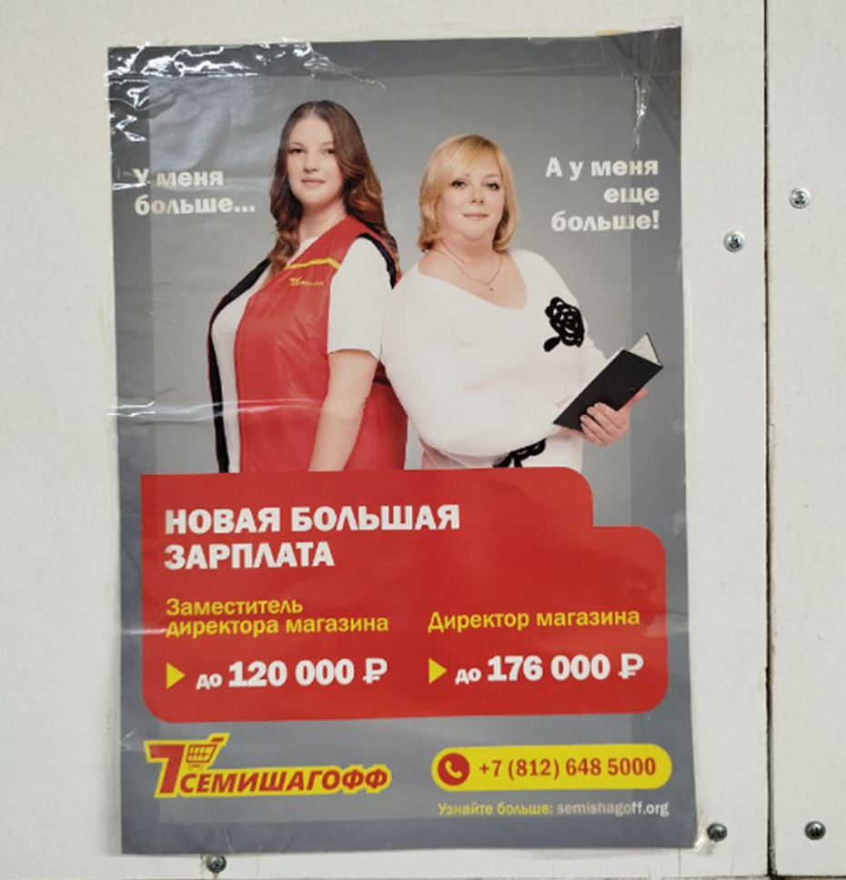 Читатели "ДП" заметили в магазинах "Семишагофф" рекламные постеры, содержание которых можно расценить, как двусмысленное. Изображённые на постерах модели "+size" спорят, у кого больше. Ниже выясняется, что речь идёт о зарплате в "Семишагове".