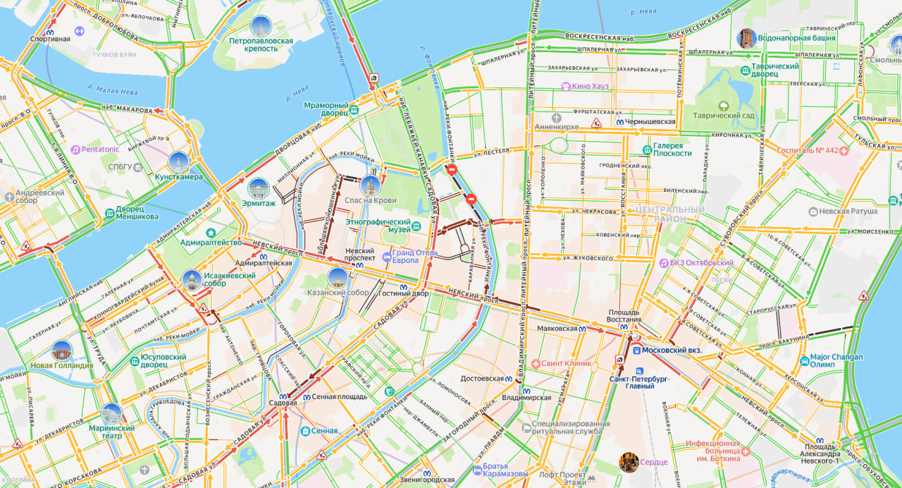 Кроме того, "побагровела" Перинная линия. Медленно движется поток на Михайловской улице и Большой Конюшенной (в обе стороны).