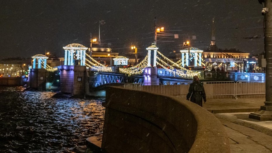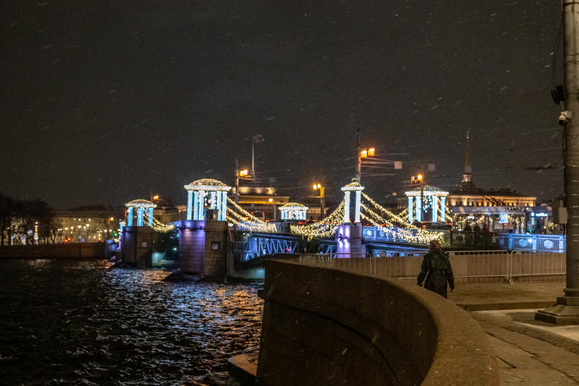 В Рождественский сочельник Дворцовый и Троицкий мосты озарит золотистая подсветка, а на факелах Ростральных колонн зажгут огни, сообщили в пресс-службе Смольного.