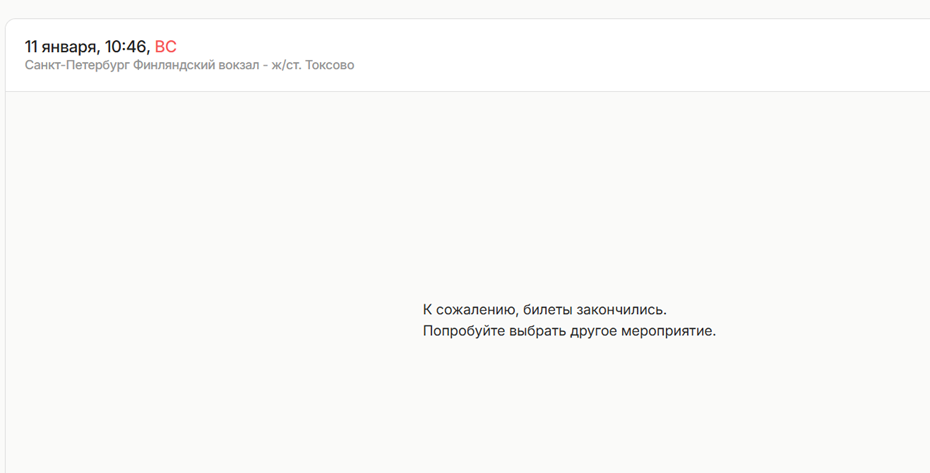 В этот раз билеты также закончились стремительно: информацию о билетах комитет по физической культуре и спорту обнародовал в полдень 7 января, и довольно быстро билетная платформа стала показывать сообщение о том, что билеты закончились на все три электрички.