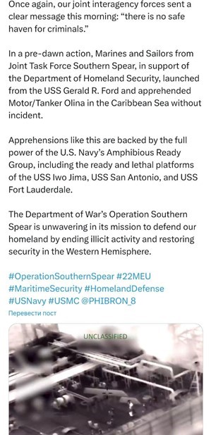 В командовании сообщили, что морские пехотинцы и моряки высадились на танкер на рассвете с борта авианосца USS Gerald R. Ford. Они задержали в Карибском море нефтеналивное судно Olina. Операция прошла штатно, сообщили в аккаунте ведомства в соцсети Х.