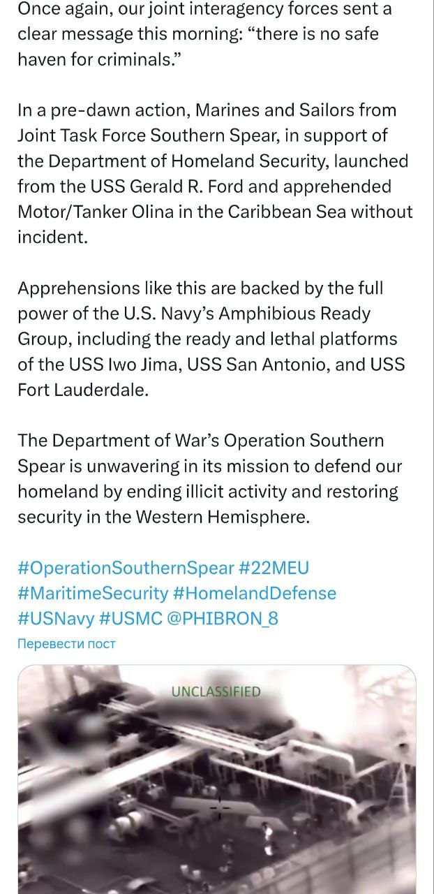 Южное командование США (SOUTHCOM) сообщило о захвате нефтяного танкера Olina, информация появилась в аккаунте ведомства в соцсети X.